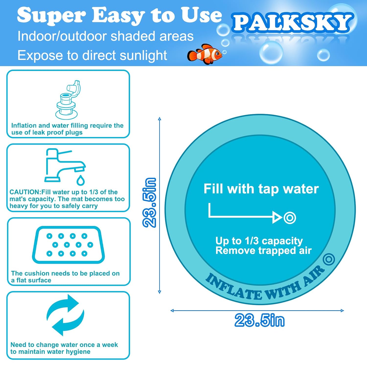 My daughter is very happy with her water play mat, as it is filled with water it's reflects a cooling effect, this round shape water play mat can get fit in low space also, my little one has a tendency to lick it, so before using I wash it properly with soap and water and after sanitizing we use it.Actually it's a good engagement activity for my little one during these summer.